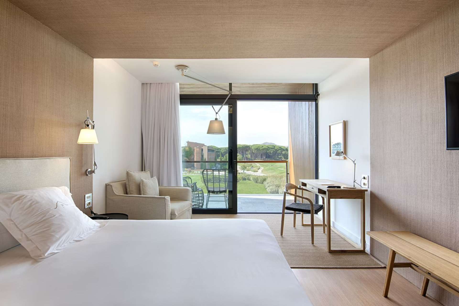 Das moderne Hotel überzeugt mit klarer Architektur und eleganter Ausstattung. Die großzügigen Zimmer bieten Ausblick auf die Golfplätze oder die umliegende Landschaft.