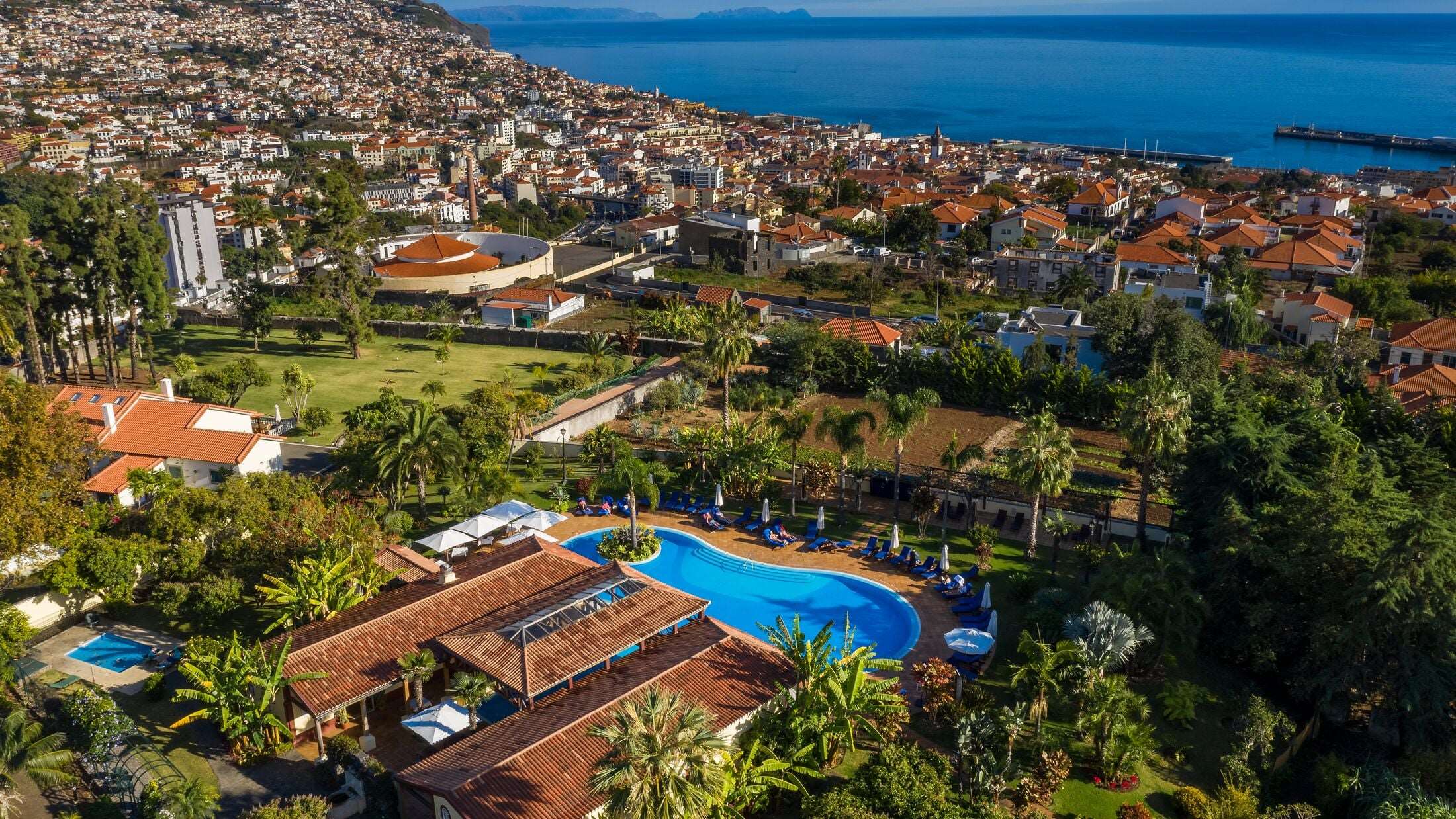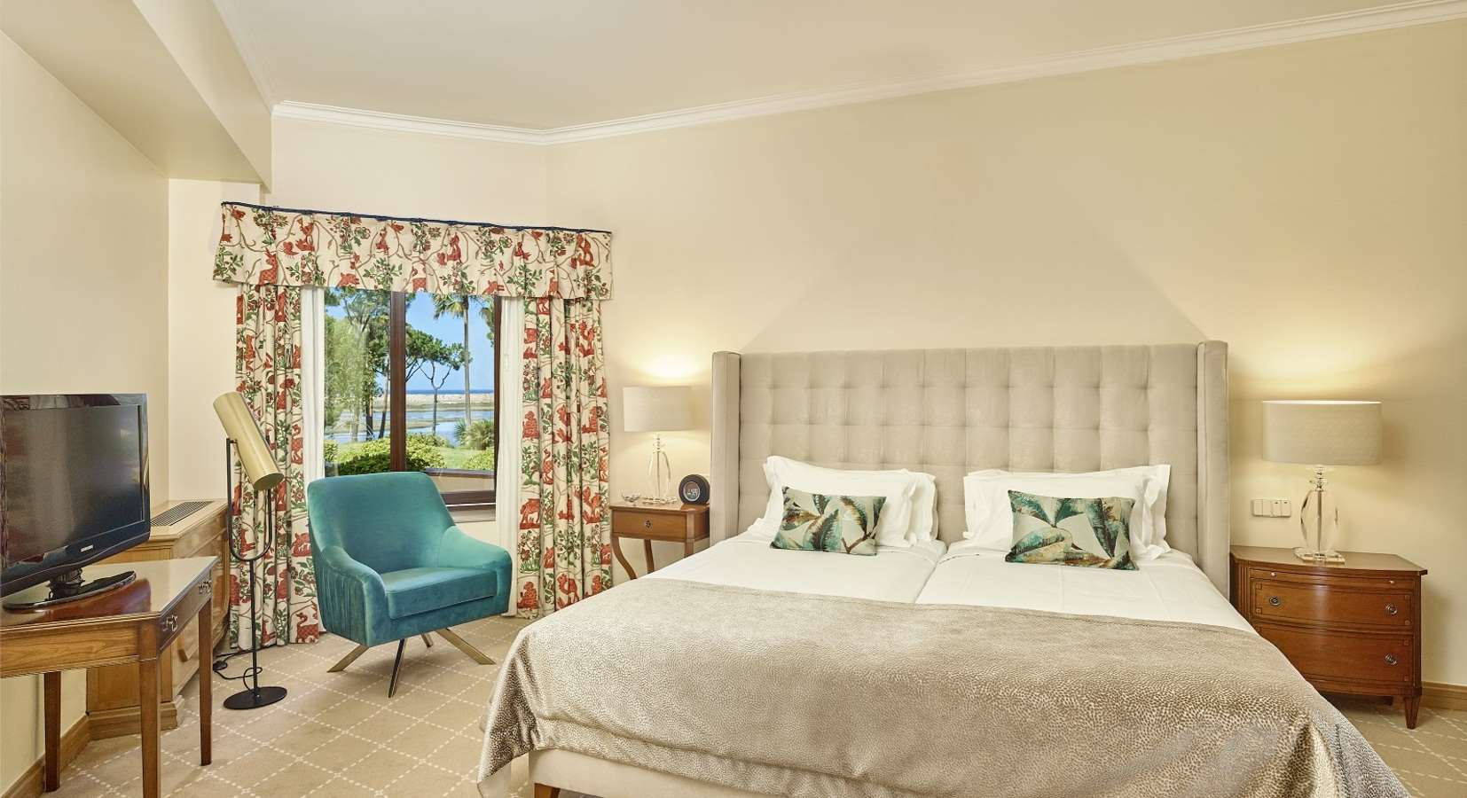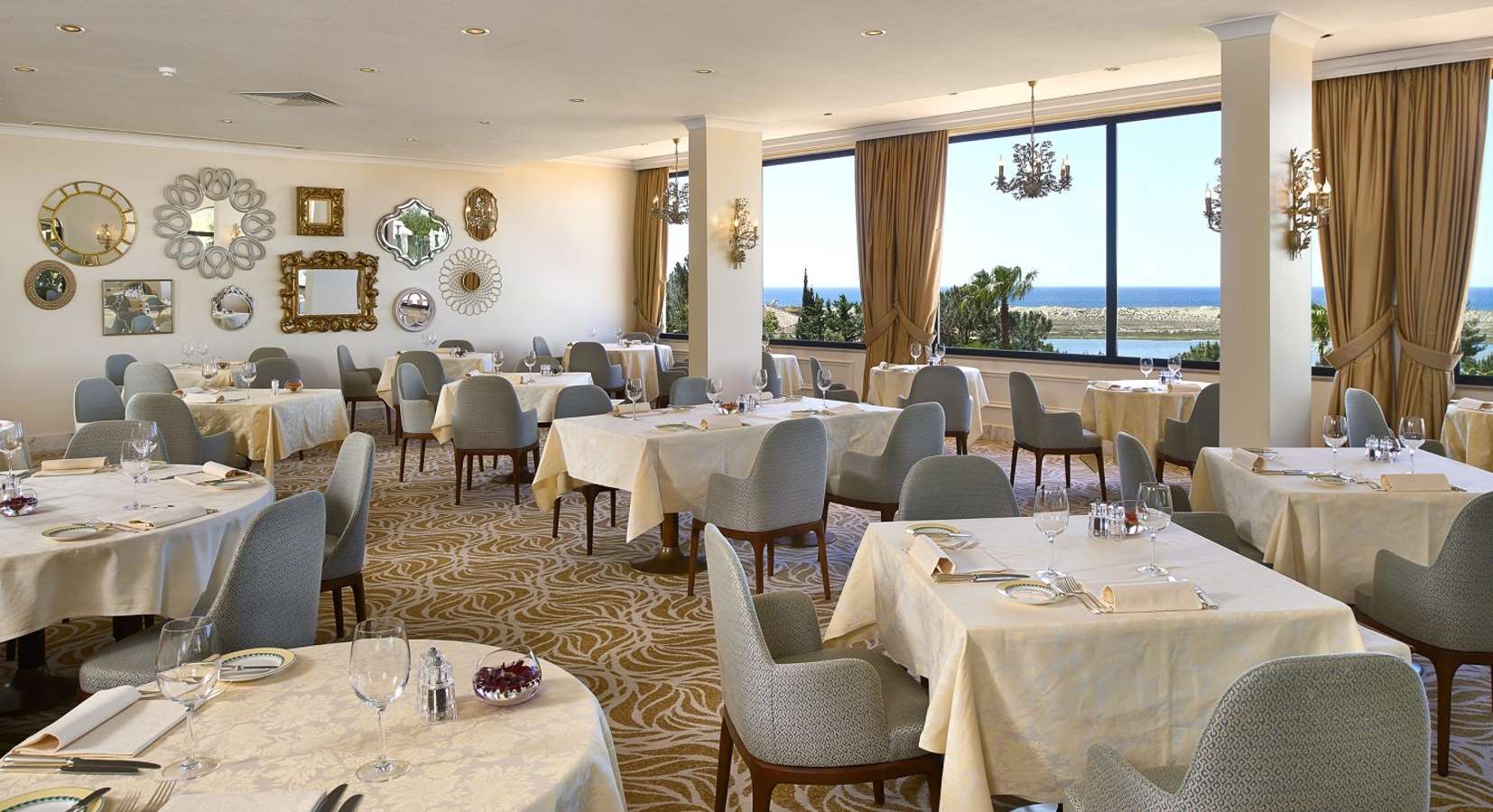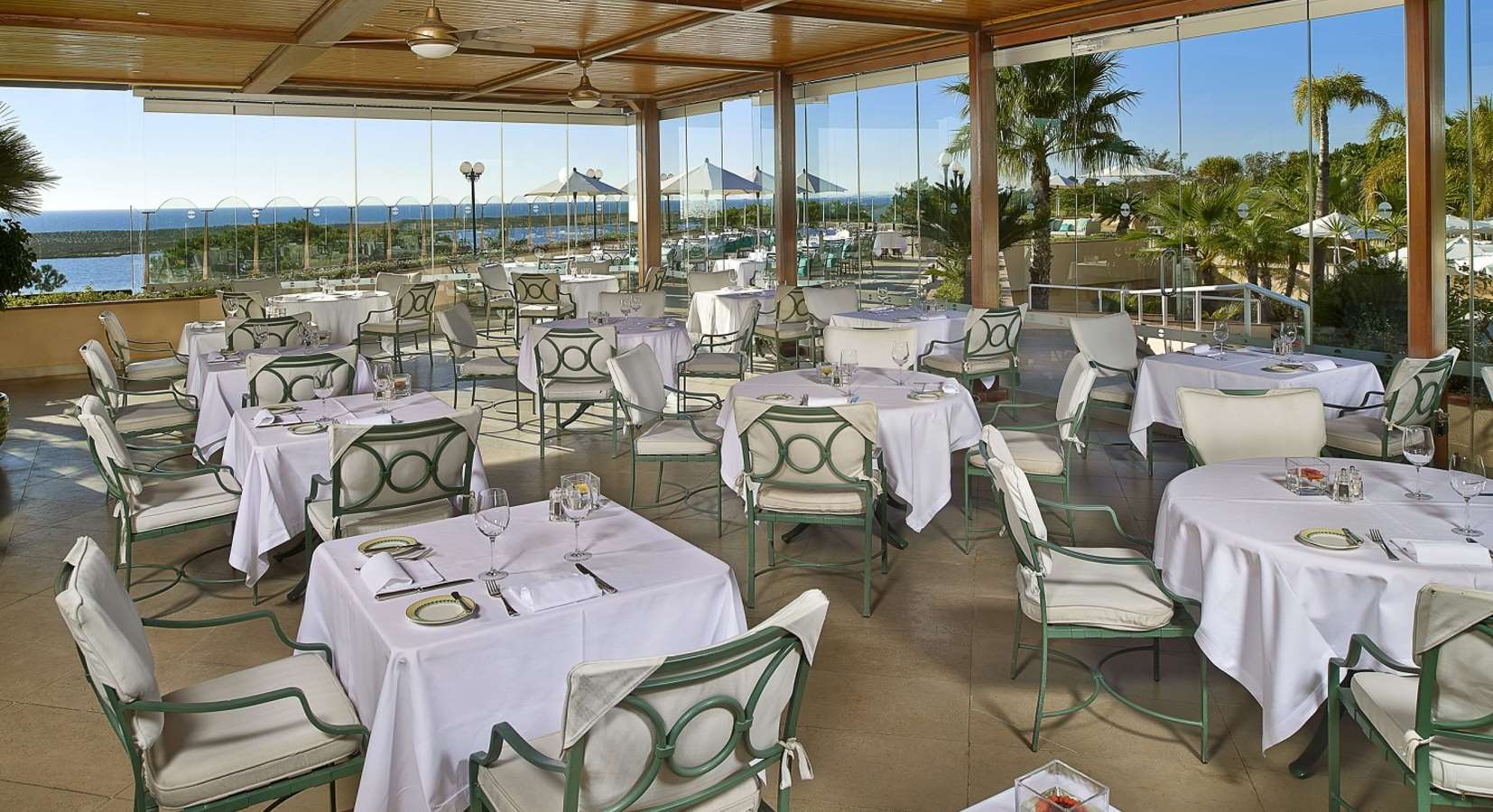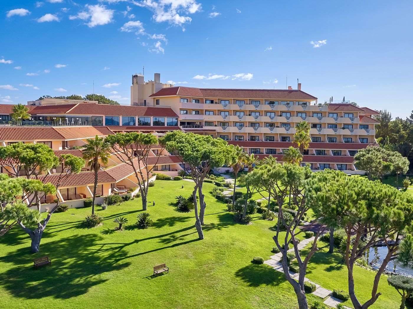 Die Zimmer und Suiten sind elegant eingerichtet und bieten Komfort sowie Panoramablick über die umliegende Natur, das Meer oder die gepflegten Gärten. Viele Zimmer verfügen über private Balkone oder Terrassen. Zu den Einrichtungen des Hotels gehören Restaurants und Bars mit internationaler und portugiesischer Küche, Aufenthaltsbereiche, Terrassen, Außenpool und Zugang zur eigenen Strandfläche.